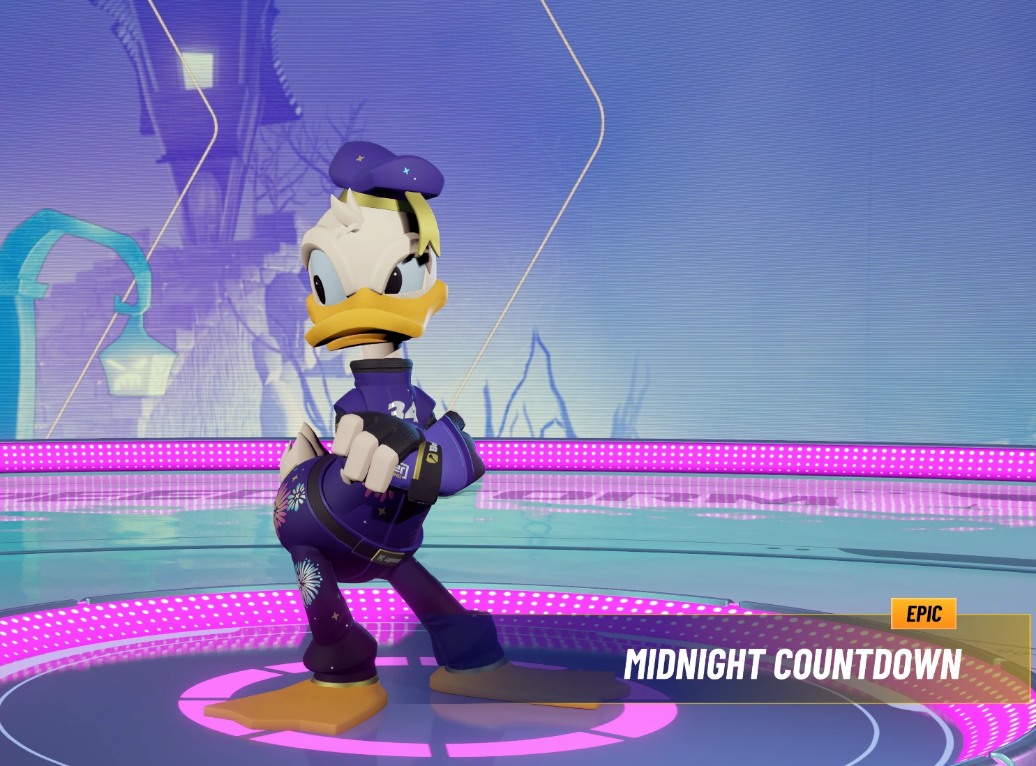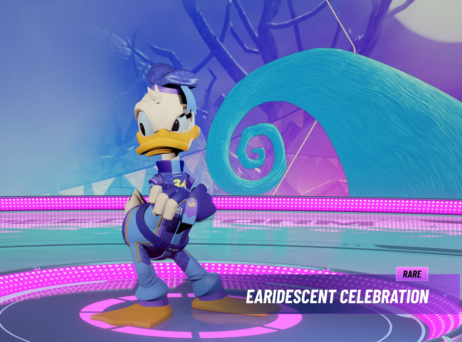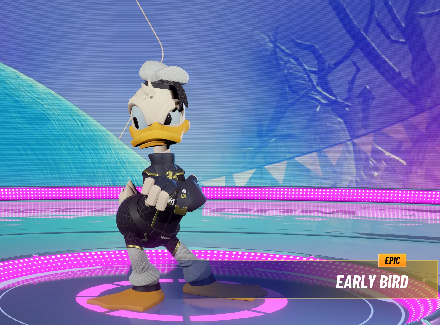 Donald is an always-annoyed anthropomorphic duck that appears in Mickey Mouse cartoons. In Disney Speedstorm, Donald's blue driving suit with yellow stripes resembles his iconic outfit from Disney animation films, and dark gray parts refer to his early original costume design. His in-game personality was also inspired by his Disney character prototype: he acts confident when seen on the Racer select screen and his Unique ability makes him start throwing punches at his opponents as soon as he is bothered in his sleep.