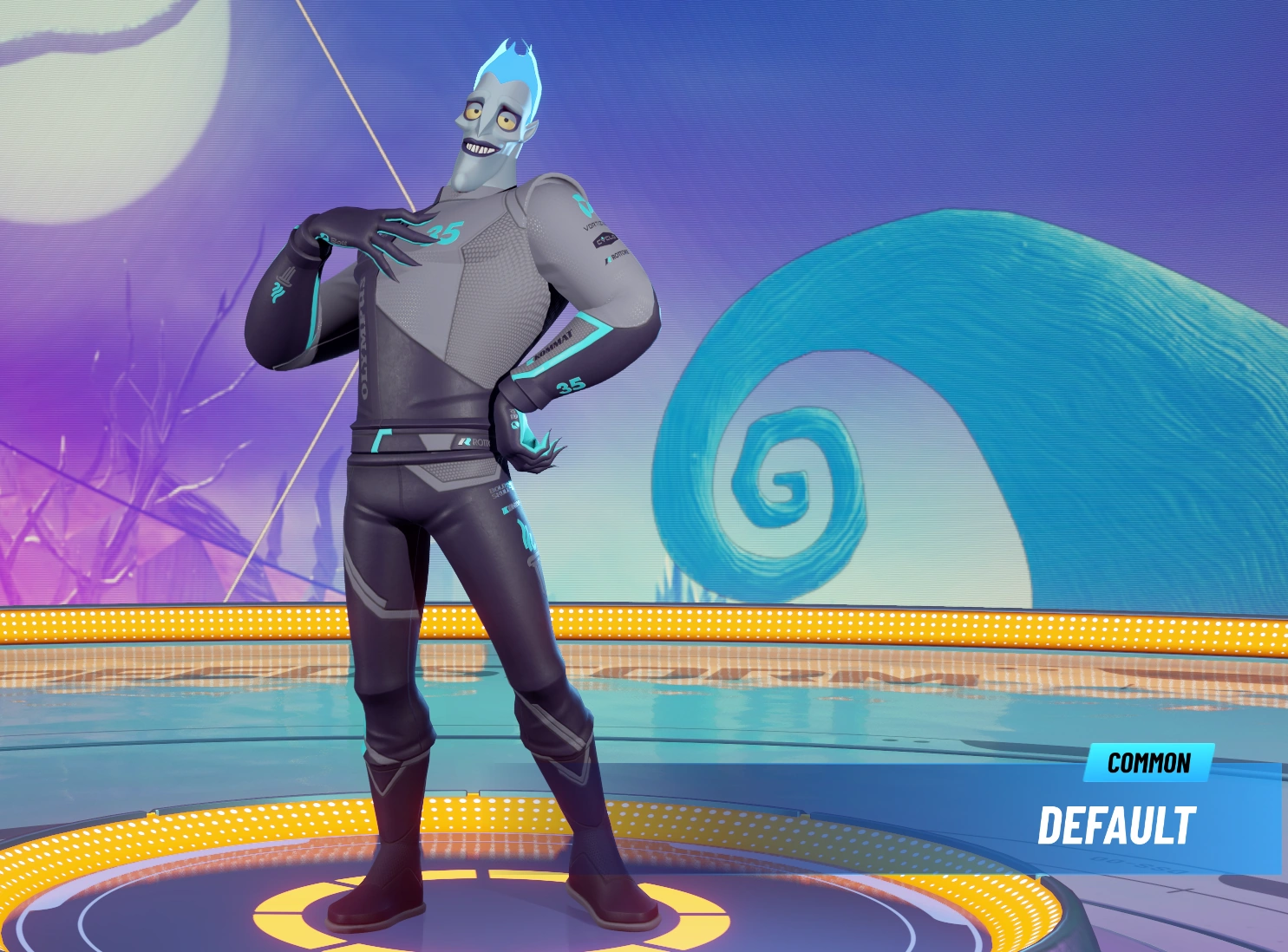 Hades is a brother of Zeus and the God of the Underworld. In Disney Speedstorm, his dark gray and black outfit from the original movie has been transformed into a dark and light gray driving suit with cyan accents on the shirt and turquoise palms of his gloves that match his fiery hair. His iconic light blue flame on the top of his head has been preserved in the game along with menacing yellow eyes. Hades's game personality is also inspired by his movie prototype: he is either very chill and relaxed leaning back in his car or completely furious burning all the opponents around him.
