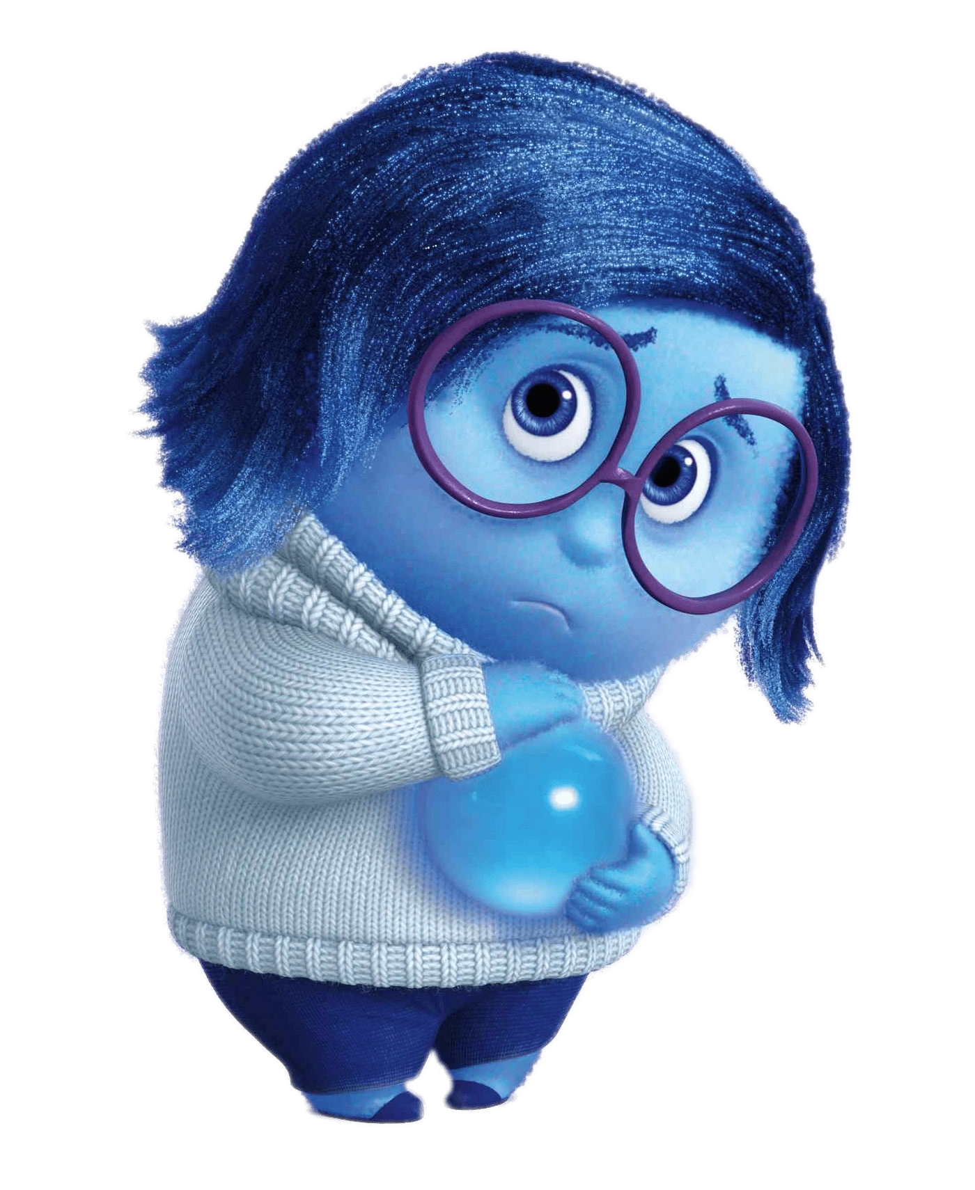 Sadness is the deuteragonist of the animated feature film "Inside Out" (2015) made by Disney&Pixar. She is one of the first emotions to appear inside the mind of Riley Andersen. Sadness's main task, as well as the other emotions', is to react to Riley's life and press buttons on the control panel depending on the situation she is in. Sadness is often pushed aside and isolated by Joy as she always makes Riley upset. Over the course of the movie, Sadness embarks on a journey along with Joy despite being too sad to walk or do anything, and eventually Joy realizes that Sadness is as important as all the other emotions, and they manage to create a combined reaction (Melancholy) to Riley's embrace with her parents.
