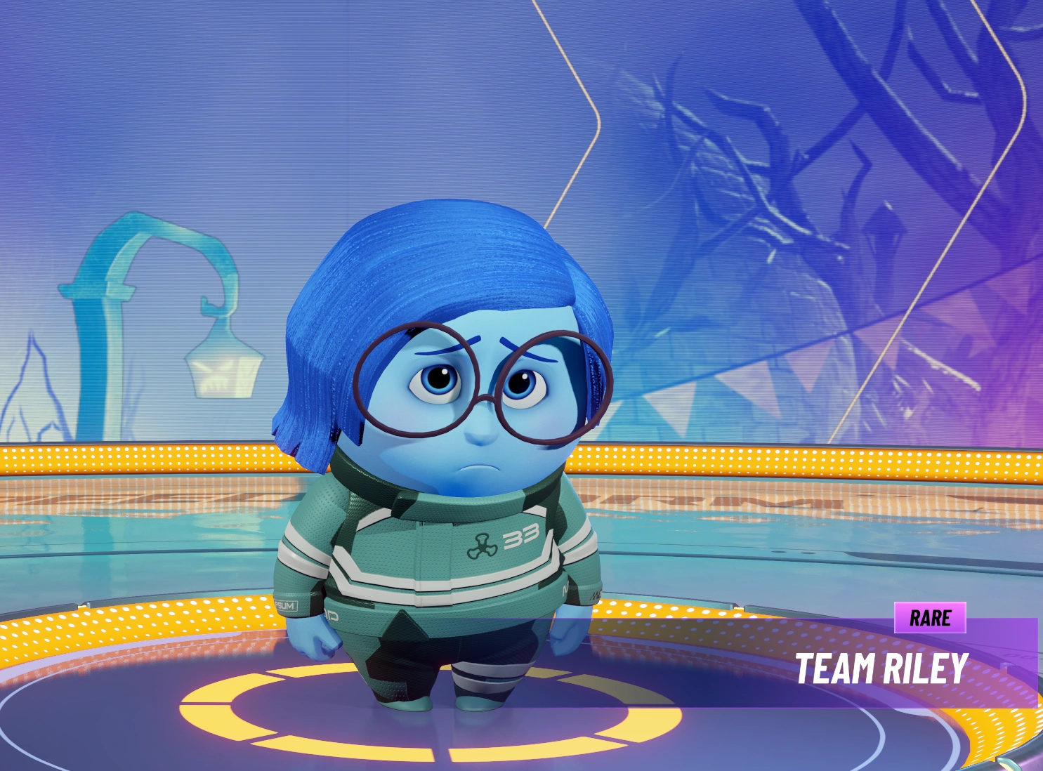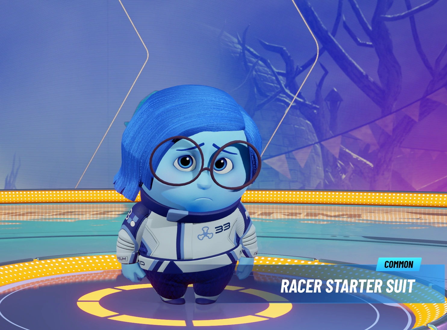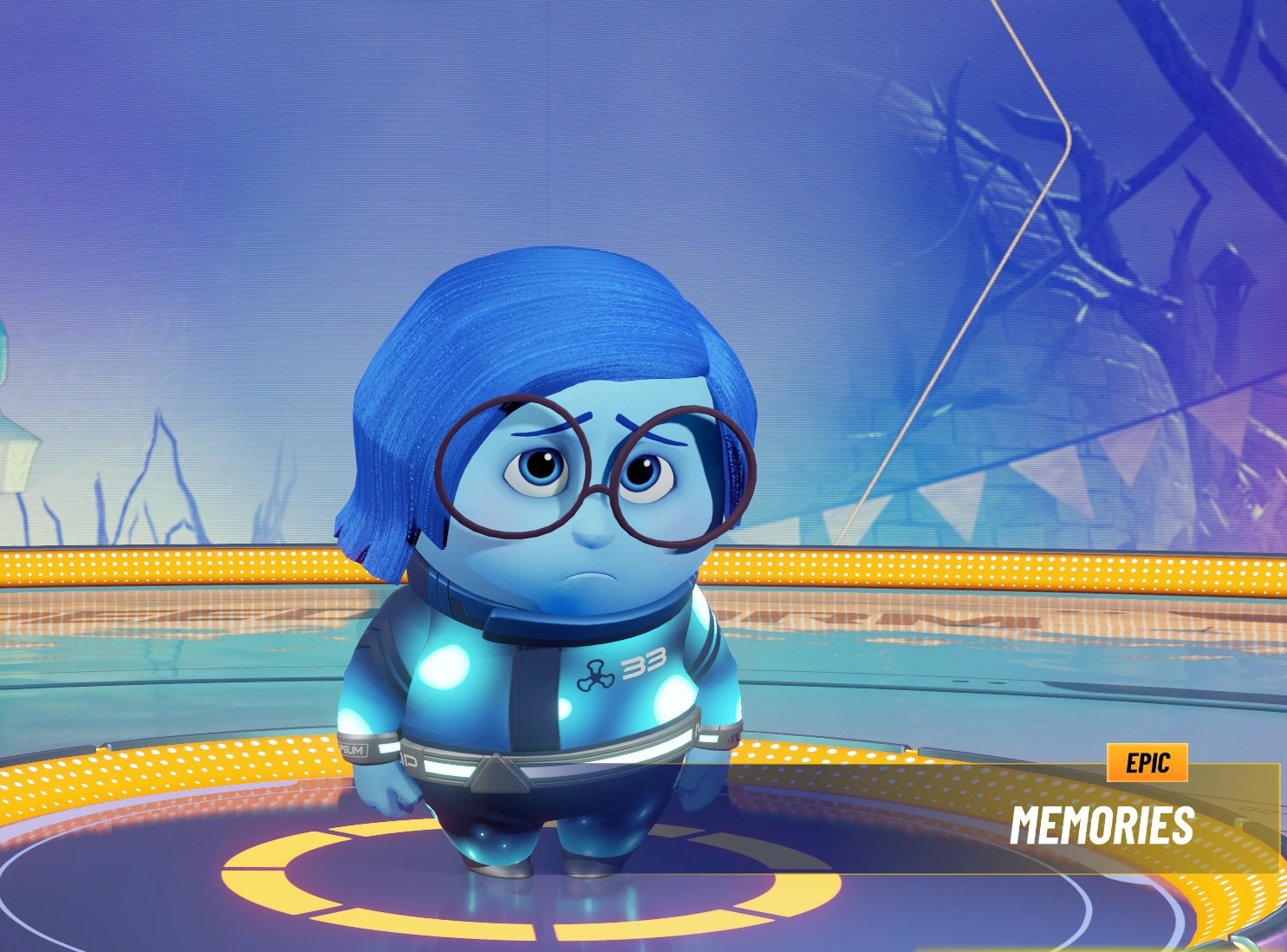 Sadness is one of the first and most basic emotions that appear in someone's head. In Disney Speedstorm, Sadness's racing suit is vaguely inspired by the blueness of the character in the original Disney film, however, most of the outfit remains blue with small light gray parts on her back, sleeves, belt and calves, unlike the cartoon where she was wearing a fluffy gray sweater. Sadness's big round glasses have been preserved in the game along with her pessimistic and indecisive personality. Her Unique ability allows her to use blue orbs to slow down her opponents or even start crying to affect them all at once.