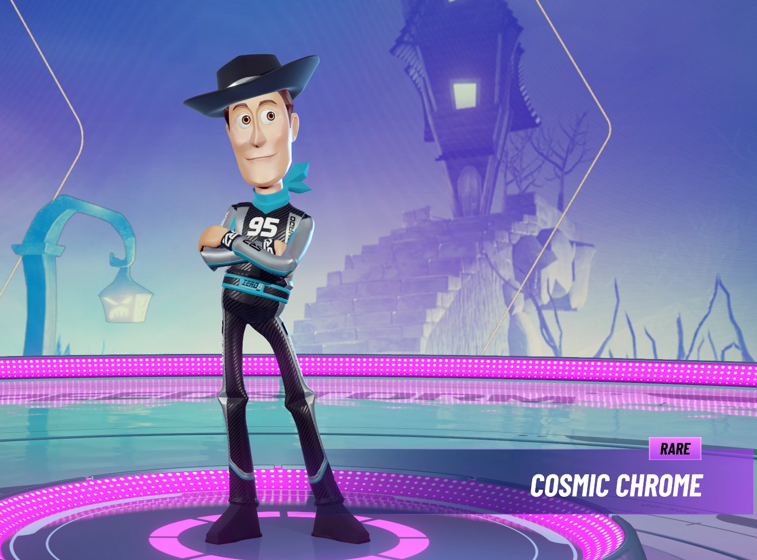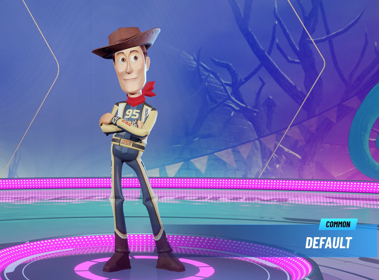 Woody is Andy's favorite toy who is suddenly replaced by Buzz Lightyear. In Disney Speedstorm, his racing suit is predominantly blue which was inspired by his dark blue jeans from the original Pixar animated film. His famous cowboy hat and cowboy boots have been preserved in the game and transformed into more neutrally modern and suitable for racing. Woody also wears the red bandanna on his neck the same way his original counterpart does. A cowboy has to have a lasso which is why Woody's Unique ability allows him to catch opponents and move himself towards them.